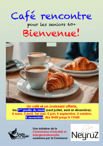 Agenda Evénements 04 octobre 2025 - 28 mars 2026 Midnight Sport Neyruz Pour les jeunes de la 8H à 17 ans > suite 04 novembre 2025 Apéritif des entreprises Réservé aux entreprises neyruziennes. > suite 06 novembre 2025 Café croissants pour les seniors 60+ ! > suite 11 novembre 2025 - 21 mai 2025 Tables de bistrots pour les seniors 60+ > suite 11 novembre 2025 - 26 novembre 2025 Séances d'information publiques au sujet de la révision des statuts de l'ARS Révision statuts ARS > suite 14 novembre 2025 Nuit du conte "Voyage dans le temps" Bibliothèque Terre-Lune > suite 21 novembre 2025 Majoritaire 2024/2025 Au restaurant La Chaumière à Neyruz > suite 22 novembre 2025 Souper annuel Ski Club de Neyruz > suite 22 novembre 2025 Atelier Cuisine durable Envie de découvrir comment apporter de la durabilité dans votre assiette avec une alimentation respectueuse de votre santé et de la nature ? > suite 28 novembre 2025 Né pour lire Bibliothèque Terre-Lune > suite 29 novembre 2025 Marché des lumières Dans la cour de l'école de Neyruz > suite 09 décembre 2025 - 10 décembre 2025 Conseil général A la grande salle de l'Aigle Noir > suite 13 décembre 2025 Atelier dessin Kawaii Bibliothèque Terre-Lune > suite 14 décembre 2025 Noël des aînés A la grande salle de l'Aigle Noir > suite 09 janvier 2026 Match aux cartes villageois Grande salle de l'Aigle Noir > suite 23 janvier 2026 - 24 janvier 2026 Concert annuel de La Cordiale A la grande salle de l'Aigle Noir > suite 03 février 2026 Réunion des sociétés locales> suite 10 février 2026 Conseil général A la grande salle de l'Aigle Noir > suite 27 février 2026 Né pour lire Bibliothèque Terre-Lune > suite 13 mars 2026 - 29 mars 2026 Les Amis du Théâtre Représentations - Les informations suivront > suite 24 avril 2026 Né pour lire Bibliothèque Terre-Lune > suite 08 mai 2026 Rencontre de printemps A la grande salle de l'Aigle Noir > suite 26 juin 2026 Né pour lire Bibliothèque Terre-Lune > suite N'hésitez pas à nous contacter pour faire paraître votre manifestation sur le site neyruz.ch.