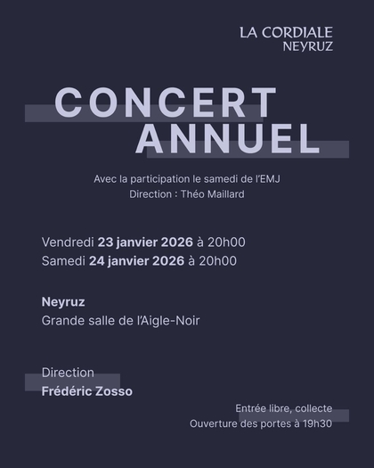 Agenda Evénements 04 octobre 2025 - 28 mars 2026 Midnight Sport Neyruz Pour les jeunes de la 8H à 17 ans > suite 17 janvier 2026 Le Cercle des Curieux Bibliothèque Terre-Lune - Salle Ecureuil, complexe communal (bâtiment halle de gym) > suite 23 janvier 2026 - 24 janvier 2026 Concert annuel de La Cordiale A la grande salle de l'Aigle Noir > suite 03 février 2026 Réunion des sociétés locales> suite 10 février 2026 Conseil général A la grande salle de l'Aigle Noir > suite 27 février 2026 Né pour lire Bibliothèque Terre-Lune > suite 13 mars 2026 - 29 mars 2026 Les Amis du Théâtre Représentations - Les informations suivront > suite 24 avril 2026 Né pour lire Bibliothèque Terre-Lune > suite 08 mai 2026 Rencontre de printemps A la grande salle de l'Aigle Noir > suite 24 mai 2026 Course la Neyruzienne Bois des Simon à Neyruz > suite 31 mai 2026 Petit déjeuner "zéro déchet" pour la population Dans la cour de l'école de Neyruz > suite 26 juin 2026 Né pour lire Bibliothèque Terre-Lune > suite 30 août 2026 Vide-grenier Sur l'Allée Jean-Tinguely > suite N'hésitez pas à nous contacter pour faire paraître votre manifestation sur le site neyruz.ch.