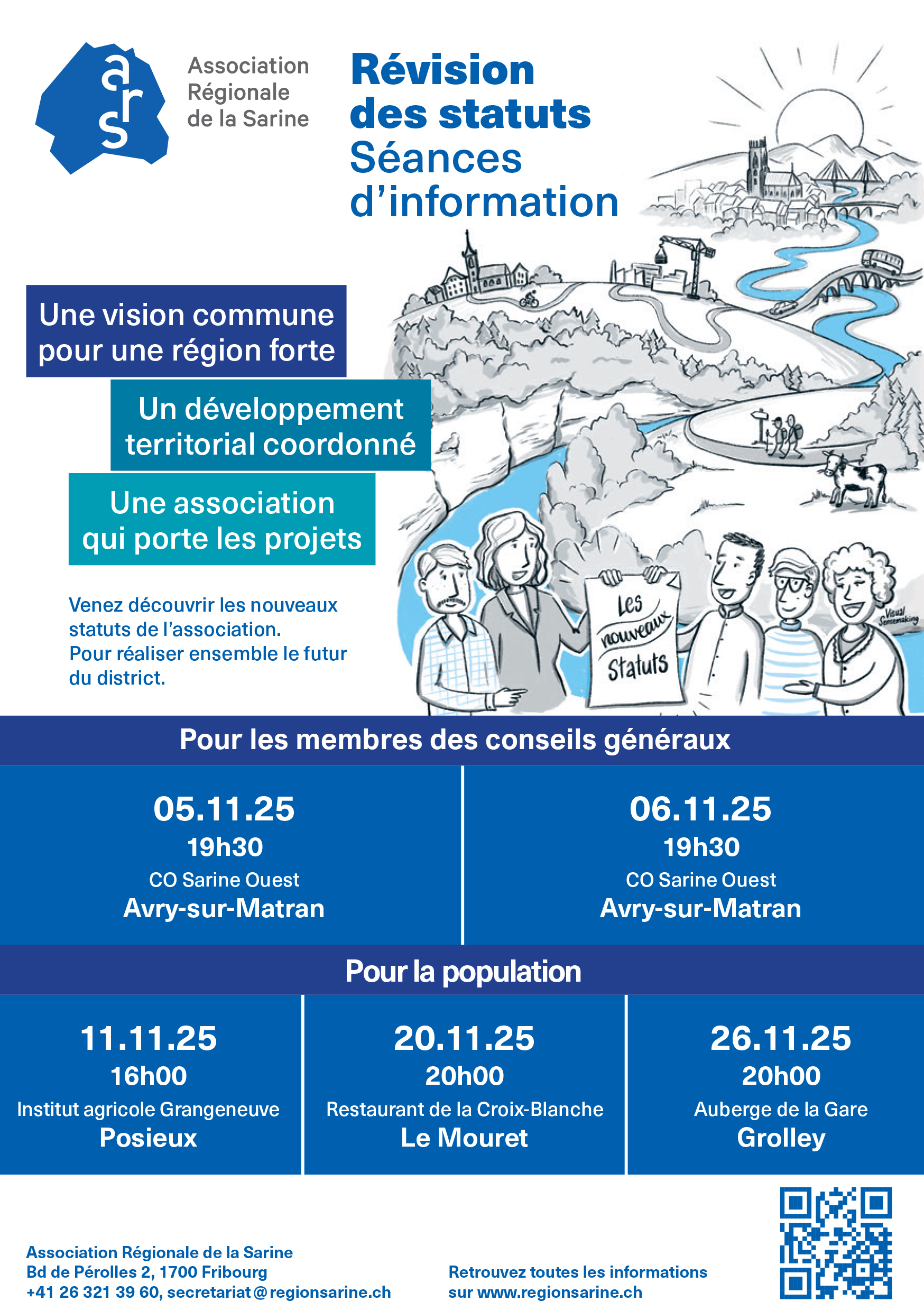 L’Association régionale de la Sarine (ARS) œuvre à promouvoir le développement territorial, économique et touristique du district. Elle a pour mission de travailler sur des thématiques qui concernent l’ensemble de la région et ses habitants, dont l'aménagement du territoire, la mobilité, l’économie, l’environnement, l’énergie, le climat et le tourisme. Aujourd’hui, l’ARS révise totalement ses statuts afin de répondre aux nouvelles exigences légales. L’entrée en vigueur de ces nouveaux statuts est prévue pour juillet 2026.